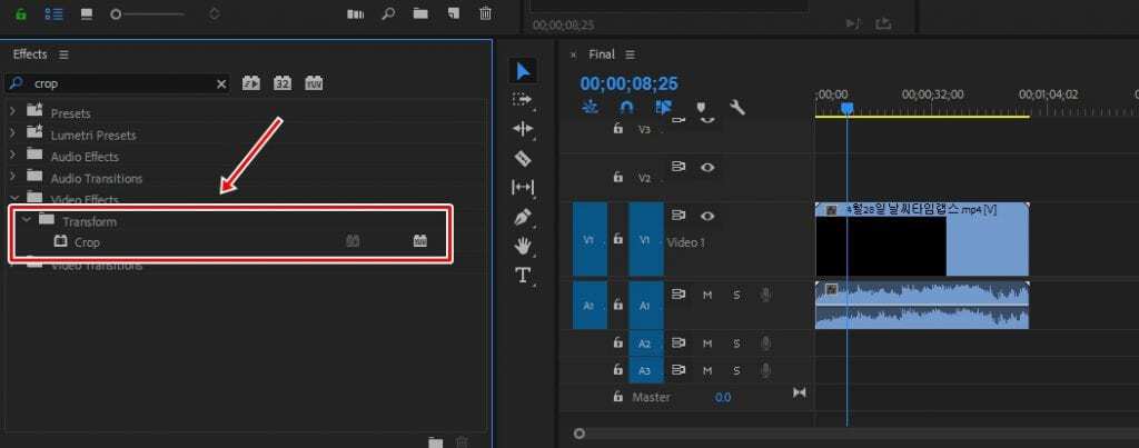 프리미어 프로CC에서 Effects 창에서 < Crop >이라고 검색을 하게 되면 Transform > Crop를 찾으실 수 있을 것입니다. 이것을 영상 자르기를 할 영상에 끌어다가 놓으시면 적용이 됩니다. 근데 여기서 영상을 통으로 넣으신 분들이라면 영상 자르기를 할 부분만 따로 컷을 해두시는 것이 편하다고 할 수 있습니다.